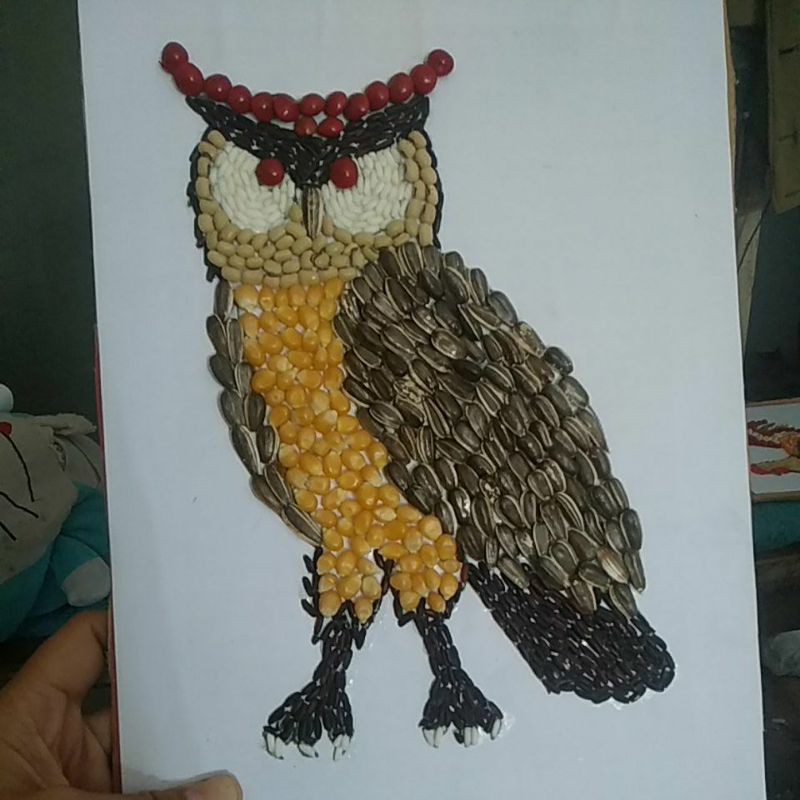 >>Kolase gambar burung hantu dari biji bijian.;
